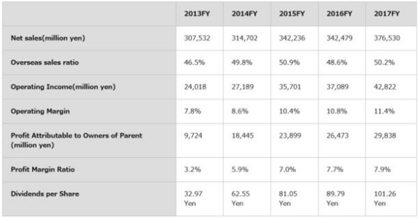 일본의 대표적인 대기업인 도요타의 매출액의 1% 수준인 강소기업이다. 수출은 2015년 최고였다가 주춤한 상태이다.