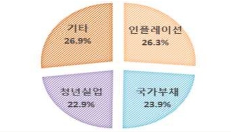 ※ 다음으로 ‘부동산시장 불안(20.0%)’, ‘한국사회 분열과 갈등 심화(11.8%)’, ‘청년실업 및 고용문제(10.6%)’ 등의 순으로 나타남