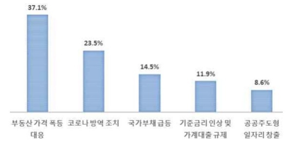 ‘유가급등, 밥상물가 상승 등 인플레이션 확대·지속’이 1순위(26.3%)로, ‘국가부채 급증(전국민 재난지원금 논란 등)’이 2순위(23.9%), ‘청년실업 및 고용문제’를 3순위(22.9%)로 응답