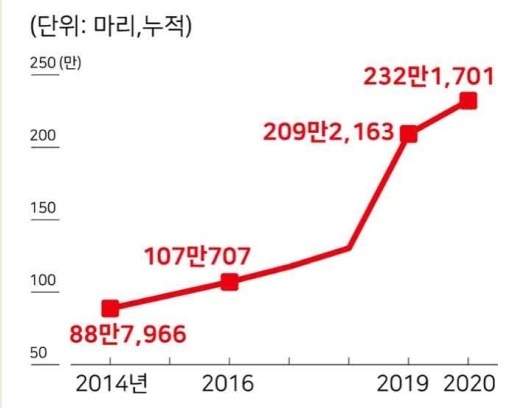 ◇ 농림축산식품부에 따르면 반려동물의 등록 숫자는 꾸준히 증가하는 추세로 ’20년 기준 232만1,701마리(전년 대비 11%↑)로 나타남