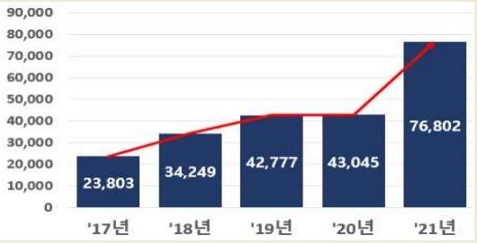 ※ 투자건수(건) : (’17) 2,417 → (’18) 3,150 → (’19) 3,713 → (’20) 4,231 → (’21) 5,559