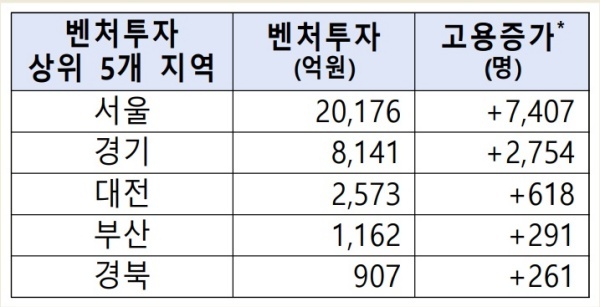 ▲ ’20년 벤처투자 상위 5개 지역 고용 증가