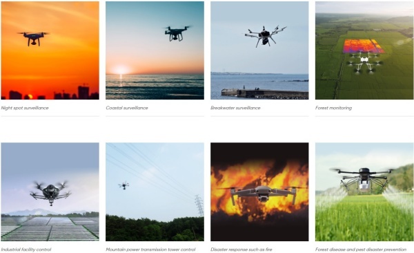 또한 산업 시설 제어용 드론, 산악 전력 전송 타워 제어용 드론, 화재 등 재해 대응용 드론, 산림 병해충 방제용 드론, 장거리 운송 및 배송용 드론, 골프 게임 방송용 드론, 여행 사진 촬영용 드론 등 다양한 분야로 확대하고 있다.