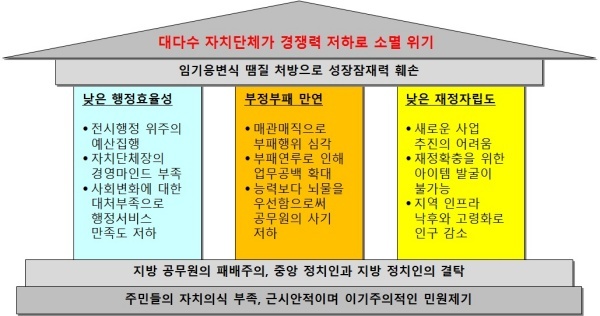 지난 24년 동안 지방자치는 낮은 행정 효율성, 부정부패 만연, 낮은 재정자립도 등으로 인해 침몰 직전의 난파선과 같은 상황에 내몰려 있다. 지방자치의 문제점을 자세히 살펴보면 다음 그림과 같다.