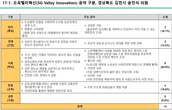 송언석 김천시 국회의원의 경우 알뜰한 나라 살림, 공정한 기회 등 지역 발전이나 현안 이슈 해결과 무관한 정치공약이 다수를 차지하고 있고, 인구가 감소함에도 공약은 일자리 창출보다는 경제 유발효과가 낮은 인프라 투자에 집중하고 있습니다.