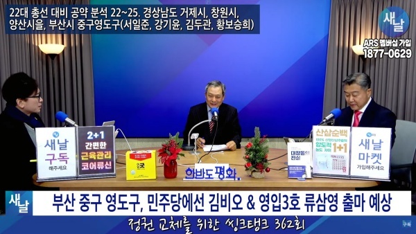 12월26일(화요일) 새날 유튜브 방송은 2020년 21대 국회의원 선거에서 당선된 부산광역시 중구·영도구 황보승희 의원이 제시한 선거공약을 평가했다. 평가를 위한 방송에는 푸른나무, 이상구 원장, 민진규 소장(국가정보전략연구소)이 출연했다.
