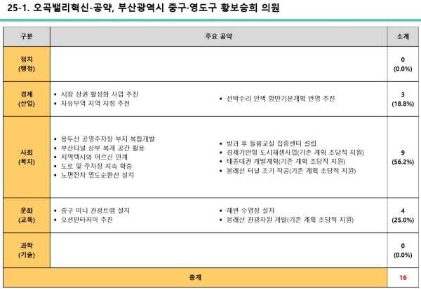 부산시 중구, 영도구의 황보승희 의원은 전체 공약이 16건에 불과하며 과학기술 및 정치경제 공약이 0%로 전무했고 대부분이 토목 및 건설 관련 공약이었습니다.