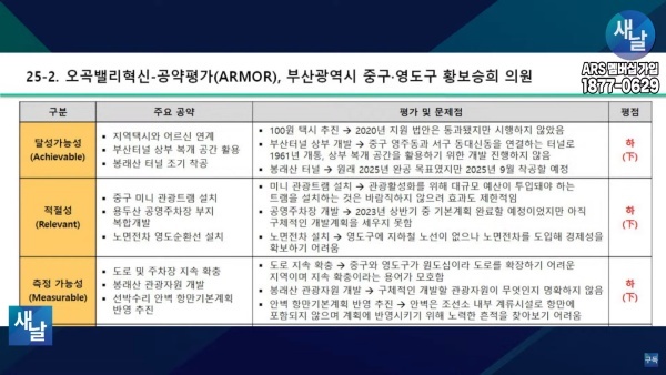 [기획-국회의원 공약 평가] 25. 새날 방송, 부산광역시 중구·영도구 황보승희 의원···달성가능성 등 5개 부문 모두 하(下) 231226