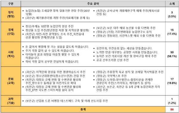 다음으로 △문화(교육) 공약 19.8% △경제(산업) 공약 17.4% △정치(행정) 공약 3.5% △과학(기술) 공약 3.5%를 각각 기록했다.
