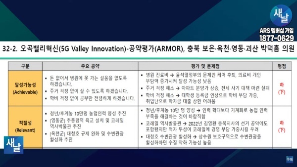 [기획-국회의원 공약 평가] 32. 새날 방송, 충청북도 보은군·옥천군·영동군·괴산군 박덕흠 의원···달성가능성 등 5개 부문 모두 하(下)