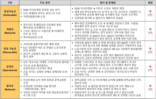 둘째, 적절성(Relevant) 측면에서는 청주 산단에 휴·폐업 공장 리모델링을 통한 벤처·창업 인큐베이터를 조성하겠다고 했지만 휴·폐업 공장보다 전용 시설을 확보해야 집적 효과가 나타날 가능성이 더 높아 이 공약은 적절하지 않은 것으로 평가됩니다.