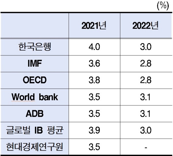 ◇ 국내외 주요기관의 '21년 우리나라 경제성장률 전망도 3.5%를 상회하는 수준으로 상향 조정하면서 국내 경기 회복세를 반영
