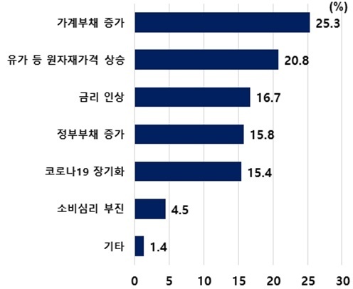 ○ 다음으로 ‘유가 등 원자재가격 상승’(20.8%)이 높고, ‘금리 인상’(16.7%), ‘정부부채 증가’(15.8%), ‘코로나19 장기화’(15.4%) 순으로 나타남