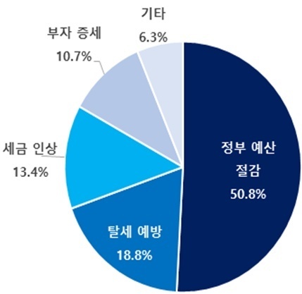 ○ 다음으로는 ‘탈세 예방’(18.8%), ‘세금 인상’(13.4%), ‘부자 증세’(10.7%) 순으로 높은 응답 비중이 나타남
