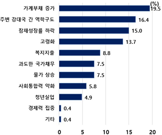 ○ 그 외에도 ‘미‧중 갈등 등 주변 강대국 간 역학구도’(16.4%), ‘잠재성장률 하락’(15.0%), ‘고령화’(13.7%) 등이 높은 응답률을 보임