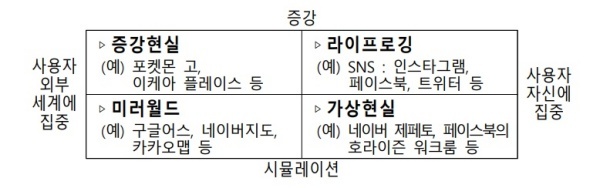 ○ 이는 현실세계 중심인 증강과 디지털 세계 중심인 시뮬레이션으로 나눌 수도 있고 사용자 자신에 집중하는 내재성(Intimate) 메타버스와 사용자 외부 세계에 집중하는 외재성(External)을 기준으로 함