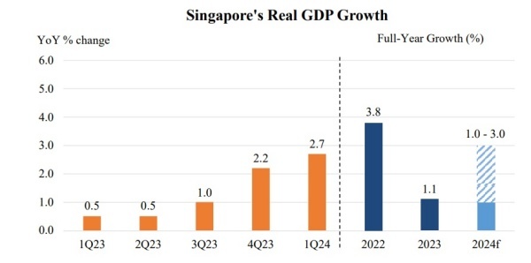 싱가포르 통상산업부(MTI)에 따르면 2024년 1분기 국내 경제 성장률은 0.1%로 집계됐다. 2023년 4분기 성장률 1.2%와 비교해 둔화된 것이다.