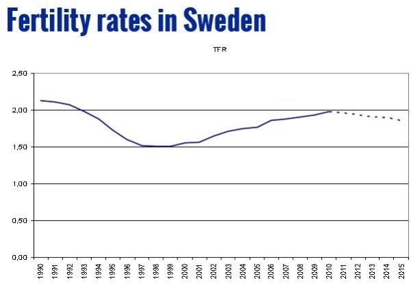 ○ 스웨덴은 평균 1.9명 정도로 다른 유럽국가에 비해 높은 출산율을 보임. 1970년대 여성의 사회진출을 유도한 이래 2014년 여성사회진출율은 73.1%(남성의 사회진출율76.5%)였으며, 최근에는 78%까지 올라갔다고 예측됨