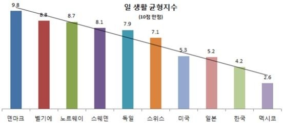 ○ 경제협력개발기구(OECD)가 발표한 ‘2015 더 나은 삶 지수’에서 일·생활 균형 수준은 7.3점으로 7위(OECD 평균 6.5점, 한국 5.8점)를 기록