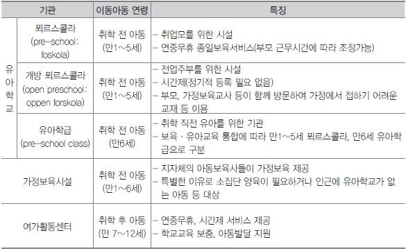 ○ 스웨덴 아동은 연령 및 부모의 취업 등 가구 여건에 따라 푀르스콜라(스웨덴 어린이집, 취학 전 유아학교), 개방 푀르스콜라, 유아학급, 가정보육시설, 여가활동센터 등을 이용할 수 있음