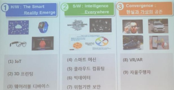그 결과 △H/W(The Smart Reality Emerge)부문은 IoT, 3D 프린팅, 웨어러블 디바이스 △S/W(Intelligence Everywhere)부문은 스마트머신, 클라우드 컴퓨팅, 빅데이터, 위험기반 보안 △현실과 가상이 공존하는 컨버전스(Convergence) 부문은 VR/AR, 자율주행차 등이 대표적인 트랜드라고 가트너는 밝혔다.
