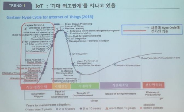 하이프 사이클에서 알 수 있듯이 사물인터넷은 기대 최고단계를 지나고 있다. 그리고 굵은 밑줄을 친 기술이 2016년 새롭게 등장한 기술들로 굉장히 많다. IoT분야에서도 새로운 세부기술이 지속적으로 태동되고 있는 것이다.