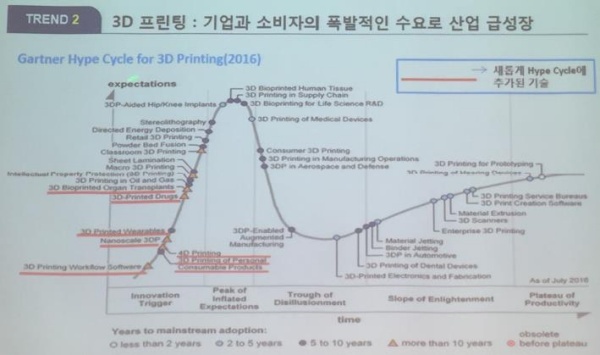 3D 프린팅은 선진 기술들이 '기술 태동단계'에 많이 포진하고 있다. 또한 어떤 기술은 기술 안정화 단계에 접어들고 있지만, 어떤 기술은 기대 절정단계에, 또 어떤 기술은 기대 하락단계에 접어들고 있다.