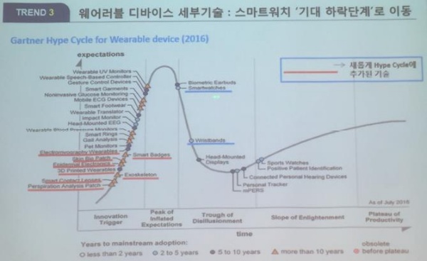 웨어러블 디바이스의 세부기술 중 하나인 스마트워치는 '기대 하락단계'로 이동하고 있는 중이다. 웨어러블 디바이스 시장은 생각보다 낮은 상태를 유지하고 있다. 손목 밴드와 스마트워치가 새로운 혁신을 일으켜 생산 안정화 단계까지 갈 수 있을지 지켜볼 일이다.