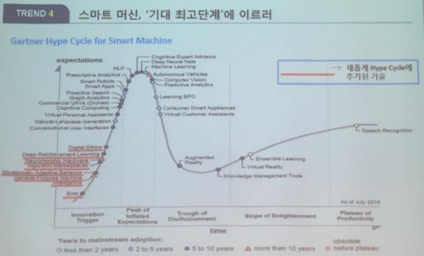 가트너에 따르면 스마트 머신은 현재 기대 최고단계를 지나고 있는데, 얼마나 빨리 기대 하락단계를 지나가느냐가 생산 안정화 단계에 도달할 수 있는 변수가 될 것으로 보고 있다.