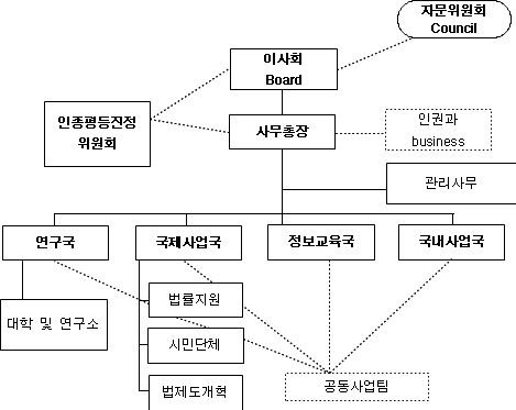 ○ 사무국은 4개 연구국, 국제사업국, 정보교육국, 국내 사업국으로 구성되어 있으며 위 4개 부서를 상호 연계해 인권전문인 교육, 연구 등을 공동 진행하는 팀(Crossed-Sectional Unit)을 운영함