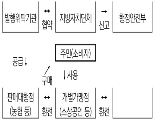 - 정부가 지정한 발행 위탁기관이 은행이나 농협 등 판매 대행점에 지역사랑상품권을 공급하고 이를 구매한 주민이 지역 내 개별가맹점에서 지역사랑상품권을 사용하는 구조로 운영됩니다.