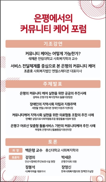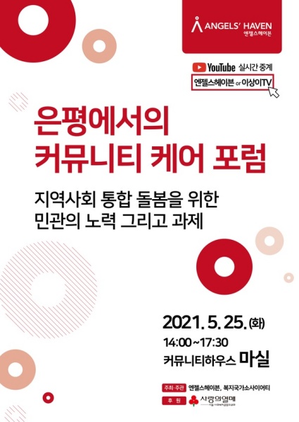 서울사회복지공동모금회의 후원으로 진행하는 ‘은평에서의 커뮤니티 케어 포럼’은 오는 25일(화) 오후 2시부터 오후 5시30분까지 온라인(YouTube 중계, 채널명 엔젤스헤이븐 또는 이상이TV) 방식으로 진행된다.