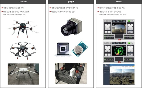 ROS(RPAS On-Smart) 솔루션은 산업용 무인비행체 기체와 지상제어시스템으로 구성돼 있다. 주요 기능으로는 높은 비행능력, 다양한 통신지원, 임무장비 호환 등의 특성을 가진 태백시스템과 기체제어, 실시간 영상확인, 자동비행, 기체정보 확인 등을 지원하는 MiDAS 등을 갖추고 있다.