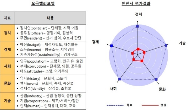 종합평가 국가정보전략연구소가 지방자치행정을 평가하기 위해 개발한 ‘5G Valley Model’을 적용해 인천시의 자치행정을 평가해 다음과 같은 결과를 도출했다.