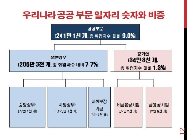 - 우리나라의 공공 부문 고용은 OECD국가 평균의 50% 수준, 선진국의 30% 수준에 불과합니다. OECD의 기준에 따라 정부가 발표한 공공 부문의 일자리는 241만 개입니다(2017년, 2019년 2월 발표).