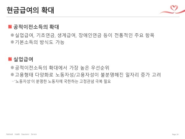 - 차기 정부에서 추진해야 할 방향은 현금 급여와 현물 급여의 설계를 각각 별도로 해야 합니다. 또한 현금 급여는 실업급여가 우선 중요합니다. 기본소득 방식도 중요성을 더해 가고 있습니다.