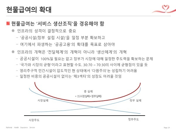 - 한국의 보건-복지 인프라는 워낙 시장이 강해 시장실패의 현상이 대부분입니다. 공공인프라를 늘리면 당연히 정부실패의 몫도 커질 것입니다. 우리가 할 수 있는 최선은 '시장실패와 국가실패의 합을 최소화 하는 것이 아닐까?'라고 생각합니다.