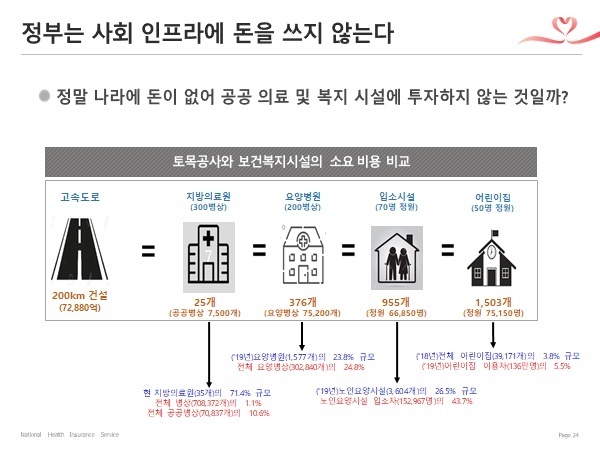 - 고속도로 단가와의 비교(1km당 360억 원 소요)해야 합니다. 서울에서 대전까지 고속도로 건설비용이라면 (200km) 300병상 이상의 지방공사의료원 25개, 공공요양병원 27개 등 많은 공공병원을 지을 수 있습니다.