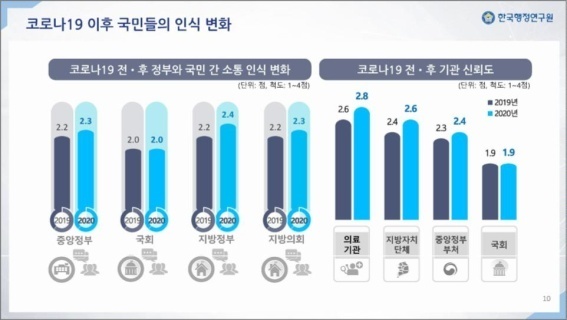 - 앞서 말씀드린 에 따르면 가족에 대한 신뢰를 비롯해 의료기관, 교육기관, 기업, 경찰과 검찰에 대한 신뢰 및 정부에 대한 신뢰는 2019년에 비해 평균 0.1~0.2점(척도 1~4점) 상승했습니다.