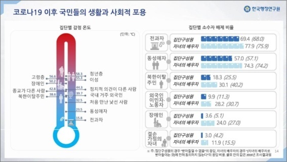 - 동일 조사에 따르면, 북한 이탈주민, 외국인 이민자와 노동자, 장애인, 결손 가정의 자녀에 대해 집단구성원 혹은 자녀의 배우자로 받아들일 수 없다는 응답은 2019년에 비해 오히려 감소했습니다. 그야말로 선진국다운 국민의식을 가지기 시작한 것입니다.